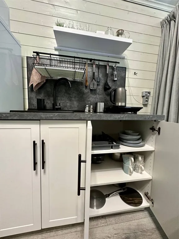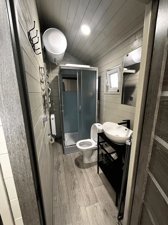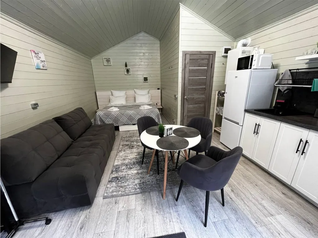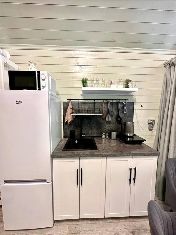 Оборудованная кухня (микроволновая печь, мойка, индукционная плитка, холодильник, чайник, посуда для приготовления и приема пищи)