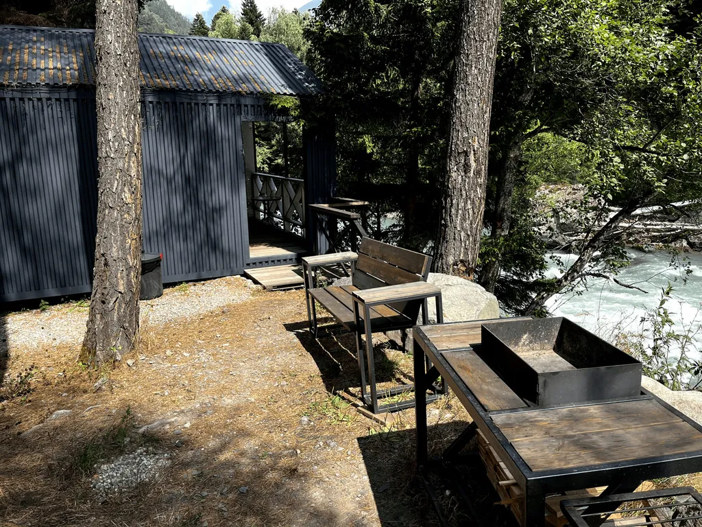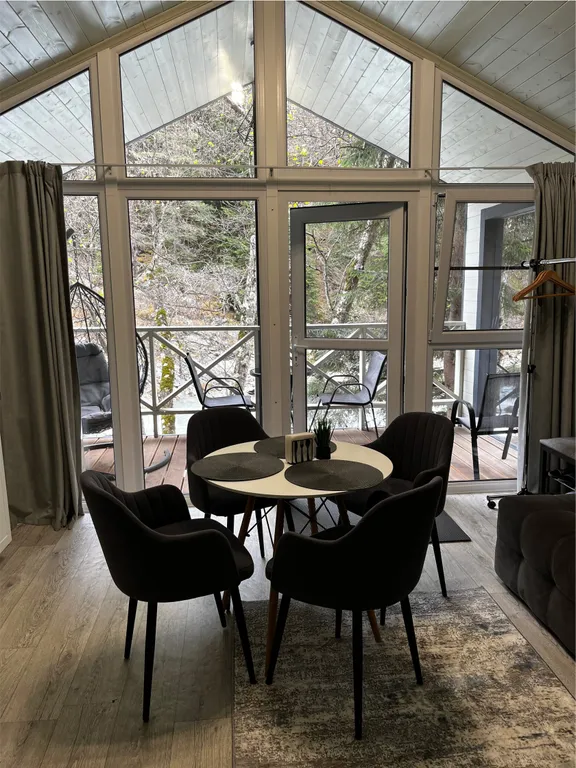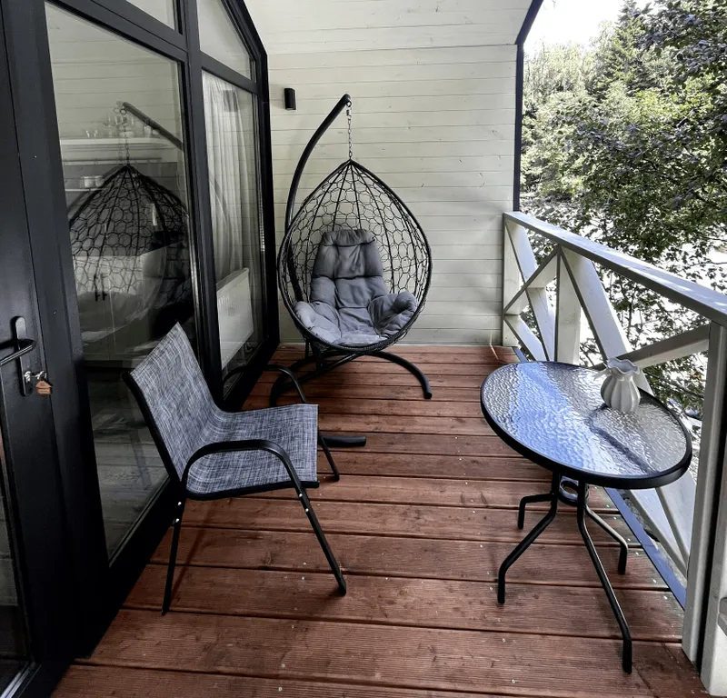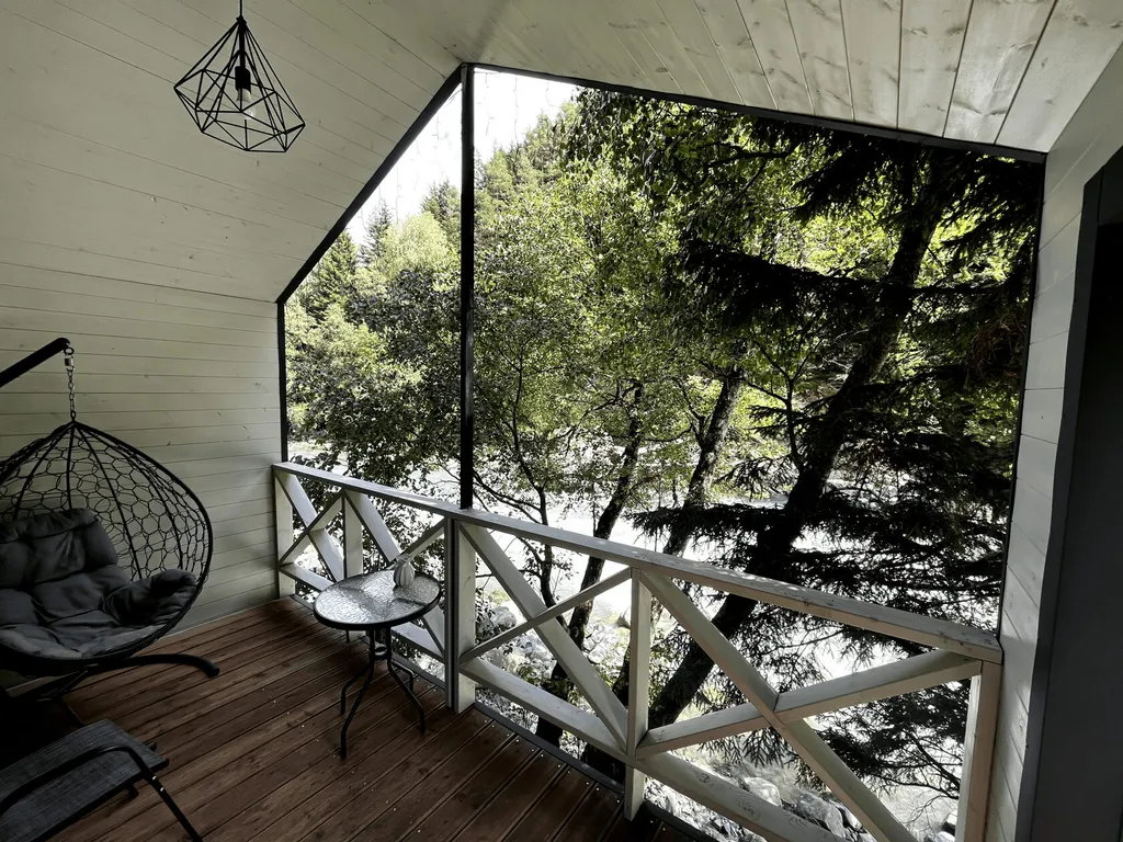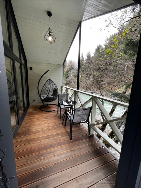 Крытая терраса с видом на реку, оборудованная уличной мебелью и качелями-коконом