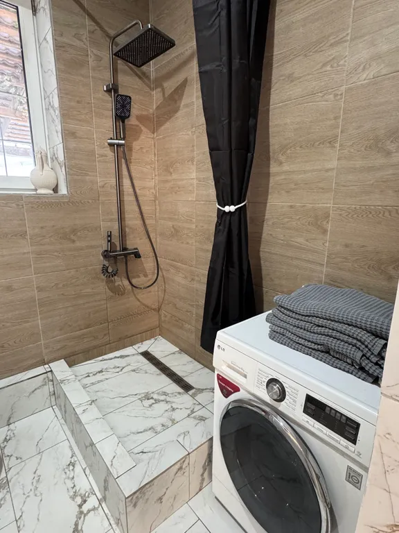 Полностью оборудованная кухня (газовая плита с духовкой, посудомоечная машина, микроволновка, холодильник, морозильник), вся необходимая посуда имеется, санузел, гостиная (3 раскладных дивана, раскладные столы и стулья имеются, телевизор, Wi-Fi), спальная комната (двуспальная кровать), спальная комната (двухъярусная кровать, раскладной диван). Во всём доме тёплые полы.