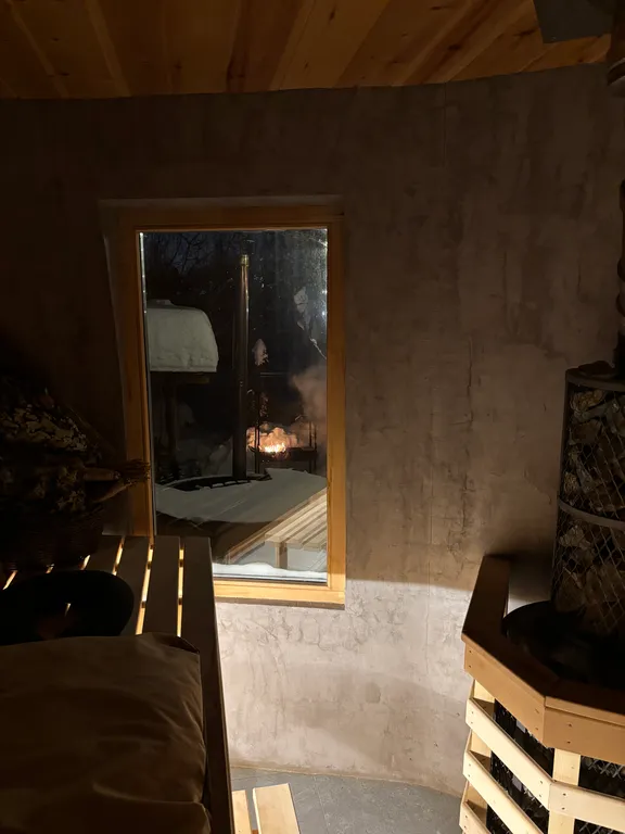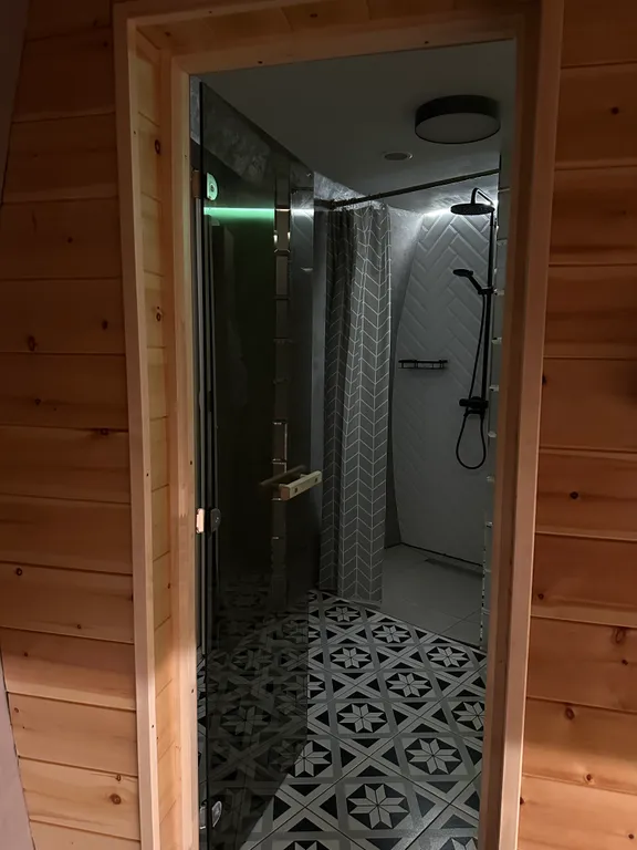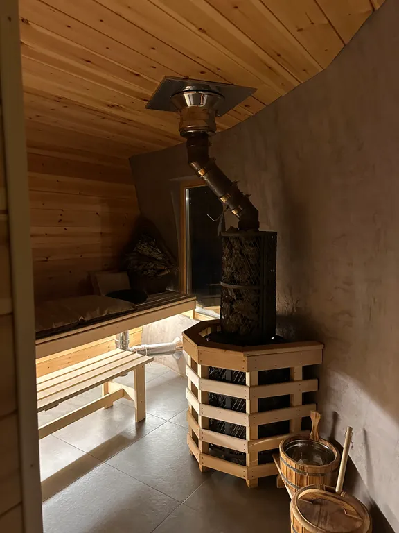 - Первый этаж: просторная гостиная, совмещенная с кухней, диван-кровать на 2 спальных места, санузел (душ и туалет), отдельная парная с дровяной печью и камнями жадеит.