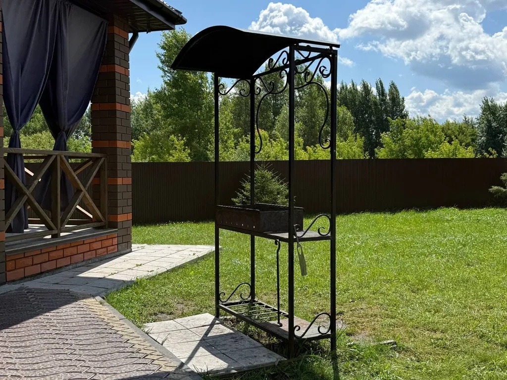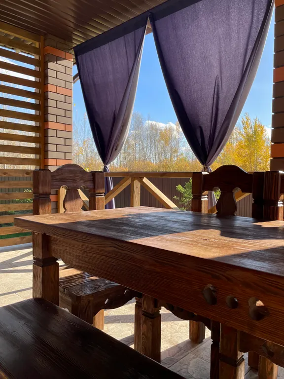 — крытая терраса с качелью и столом из дерева, мангальная зона