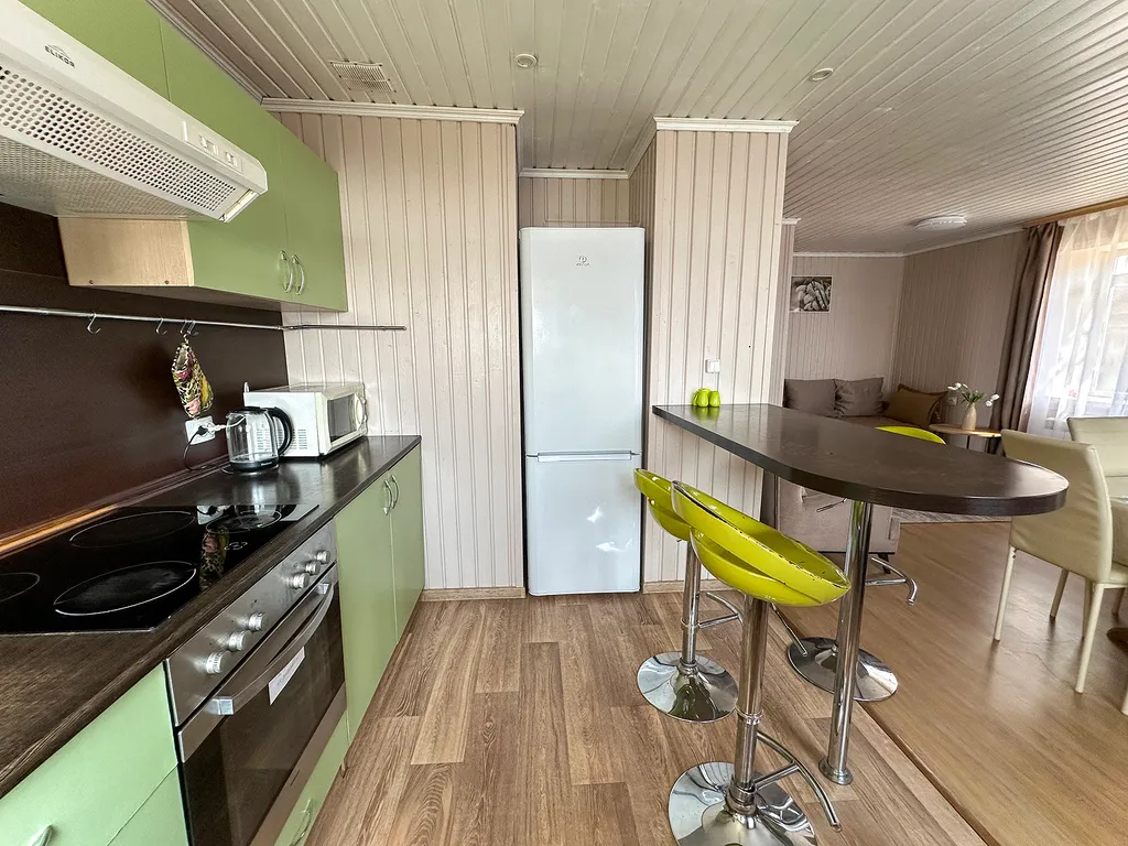 Кухня полностью оборудована посудой и принадлежностями, электрической плитой и духовкой, есть холодильник и микроволновка.