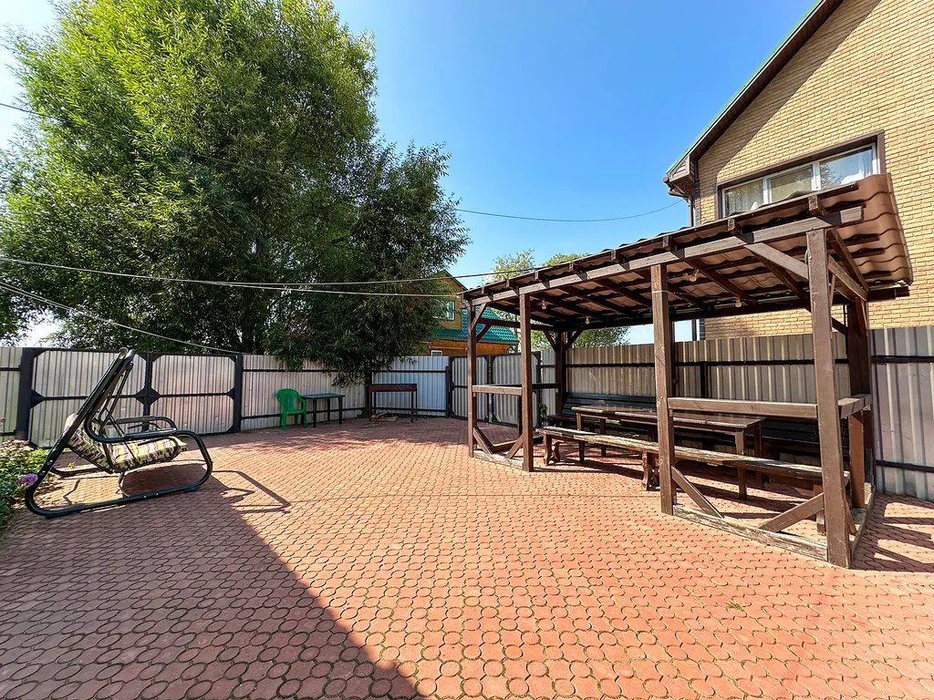 Отдельная огороженная территория с парковкой на 4 автомобиля. На площадке перед домом качалка с мягким матрасом, беседка, мангал.
