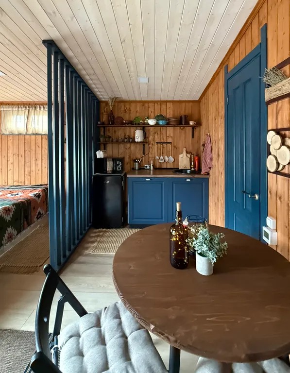 Оснащенная кухня: маленький холодильник с морозильной камерой, индукционная плитка, микроволновая печь, чайник, посуда на 4 персон, 4 комплекта столовых приборов, 2 кастрюли, 2 сковороды, бокалы на 4, открывашки, лопатки, тёрка, доски, полотенце кухонное, 2 мусорных пакета, губка для мытья посуды, тряпочка для стола, чистящее средство.