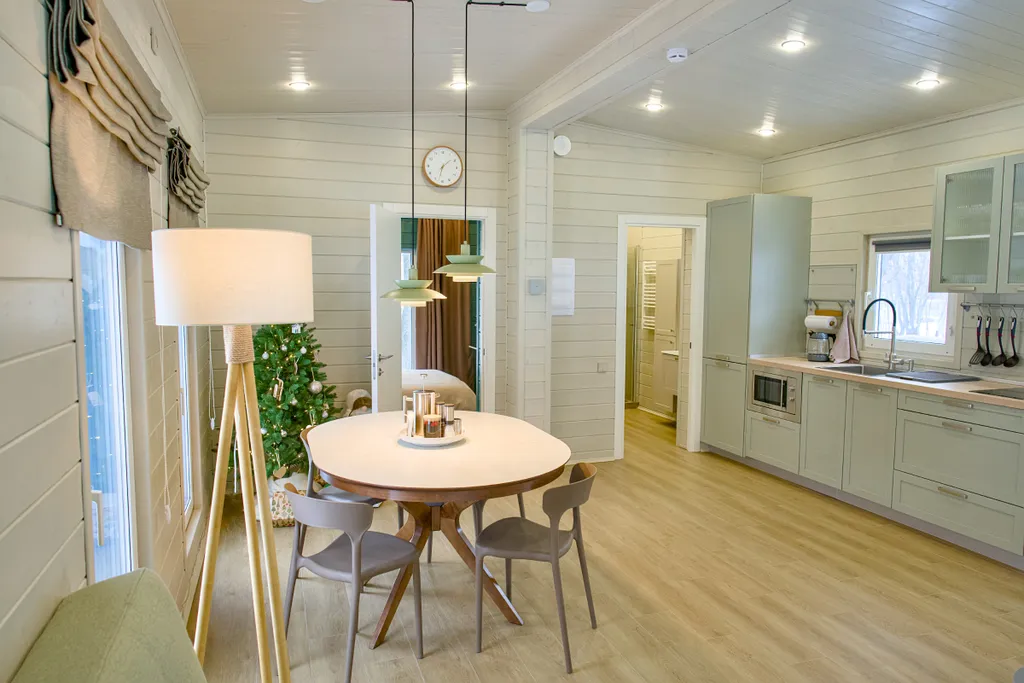 Кухня-гостиная: огромный стол на 8 персон — идеально для семейных обедов или настольных игр с друзьями. Кухня полностью укомплектована (индукция, микроволновка, большой холодильник, посуда на 8 человек).