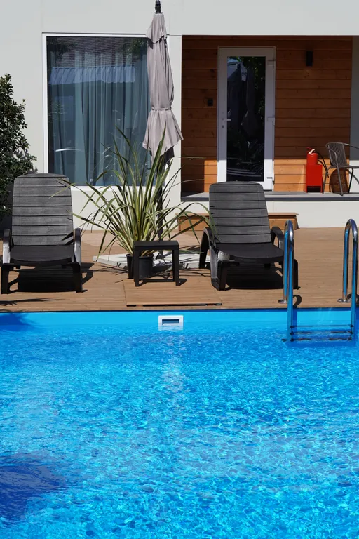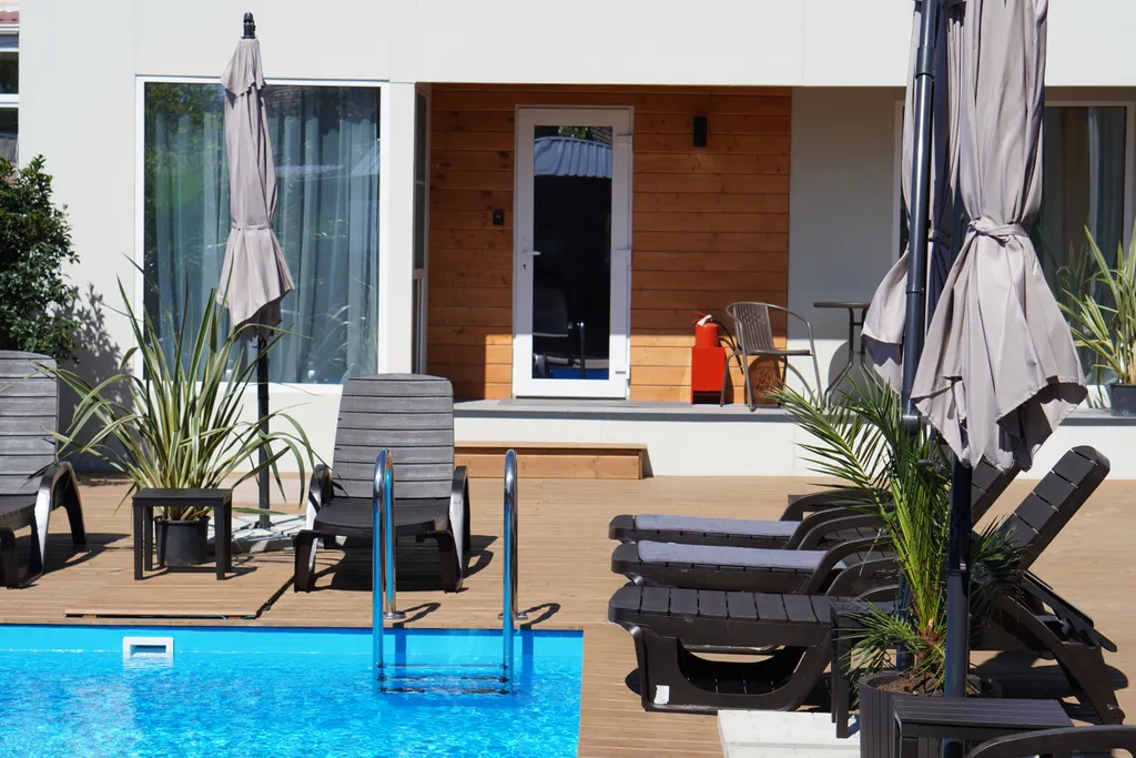 На общей придомовой территории большая терраса с подогреваемым в летний период бассейном и мангальной зоной (общая территория на шесть домов).