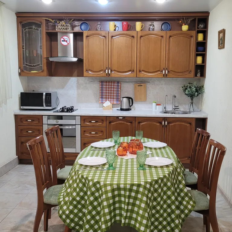 Просторная кухня-столовая оснащена всей необходимой посудой и кухонными принадлежностями с комфортным 2-спальным диваном.