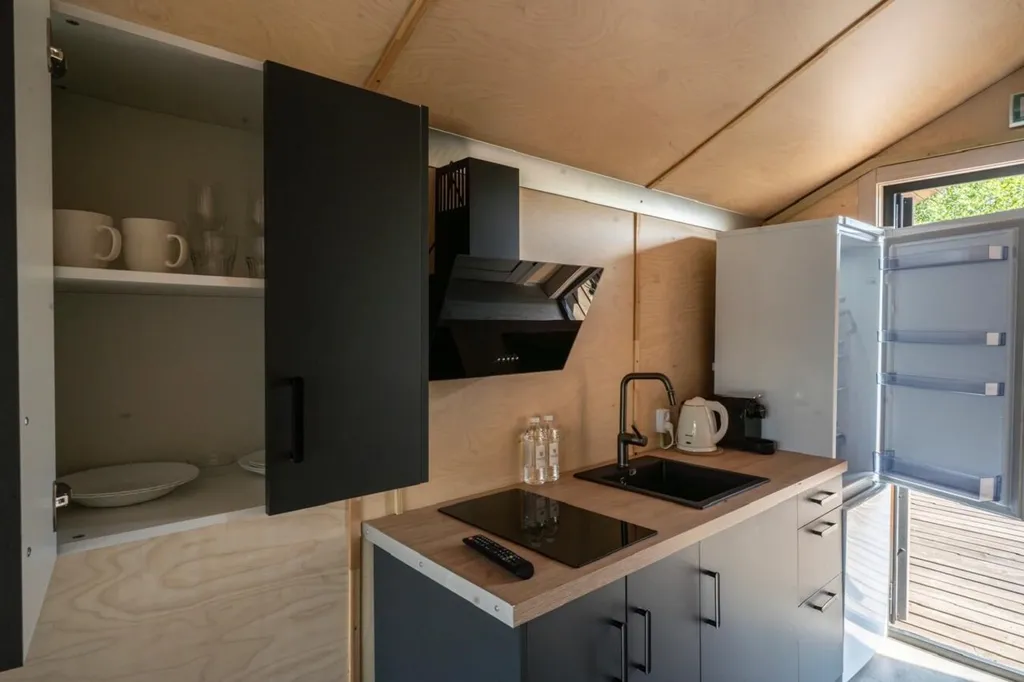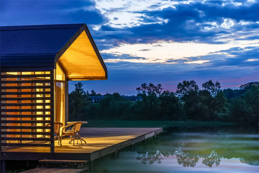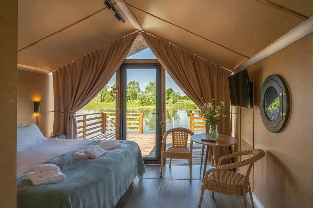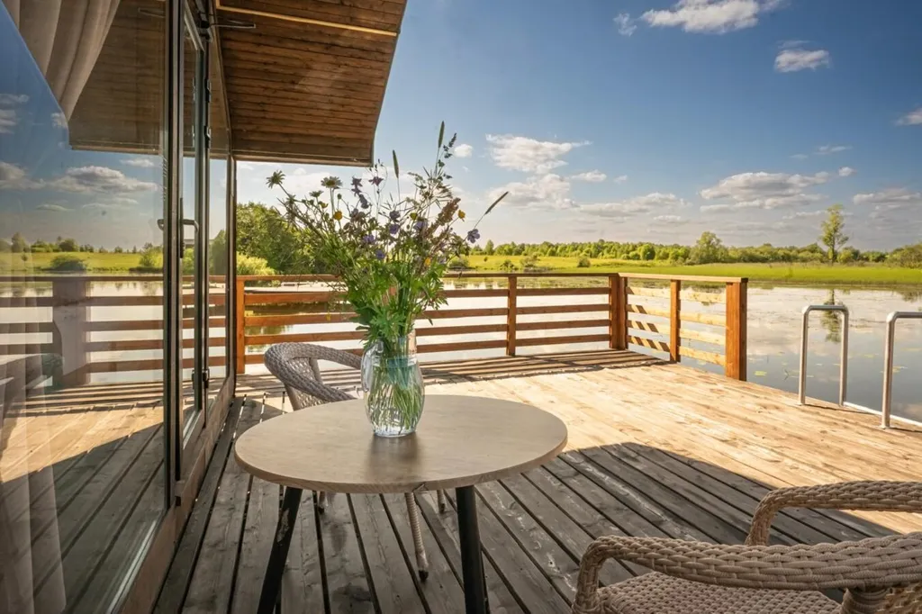Кухня с холодильником и плитой, совмещенная с спальней, отдельный туалет с душевой, терраса с возможностью организации понтона для катеров. Располагается рядом с пляжем и финской парной. 2 основных места + ребенок до 3-х лет