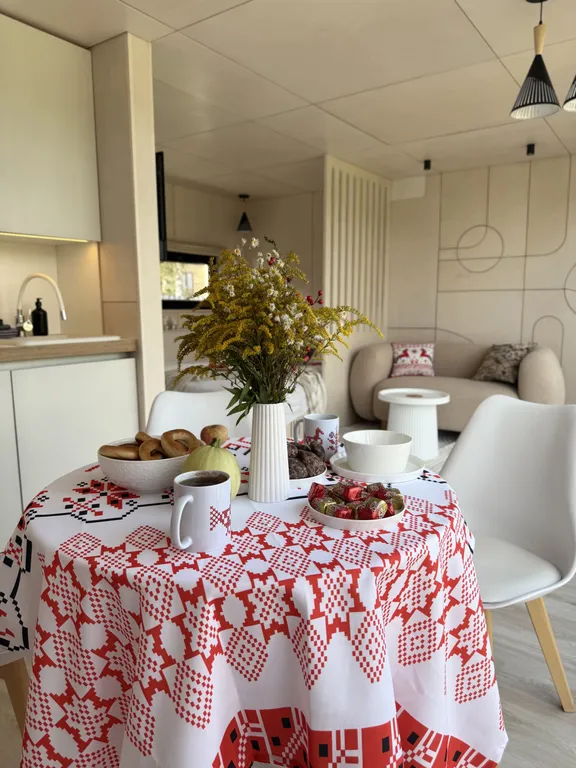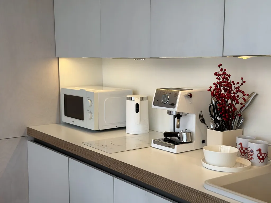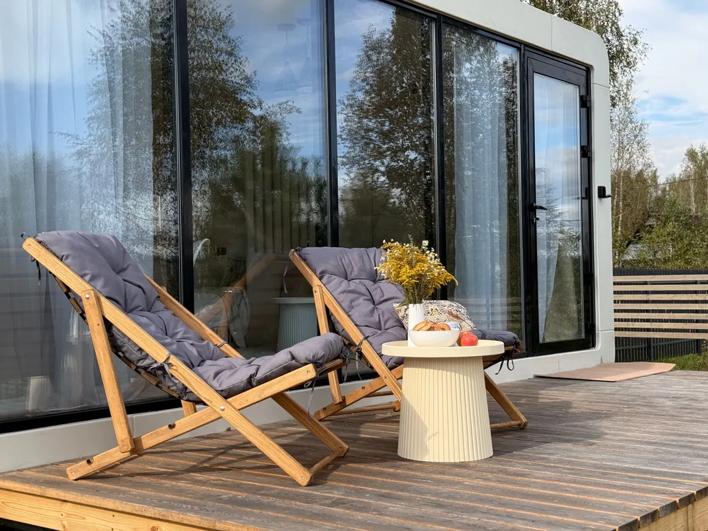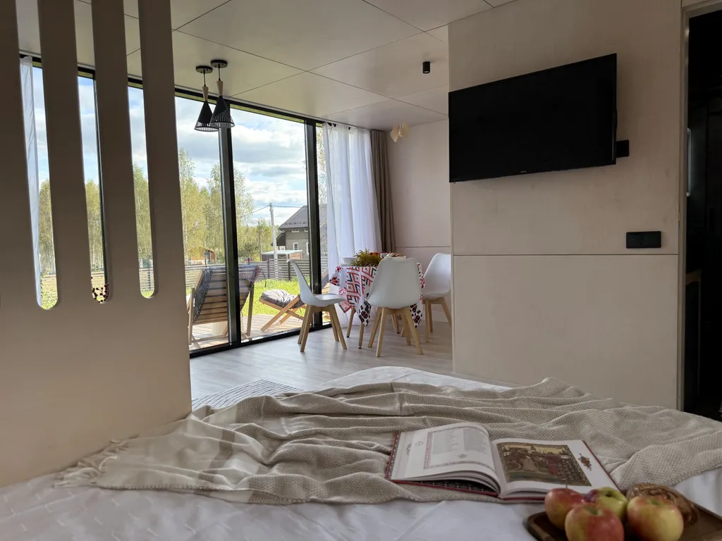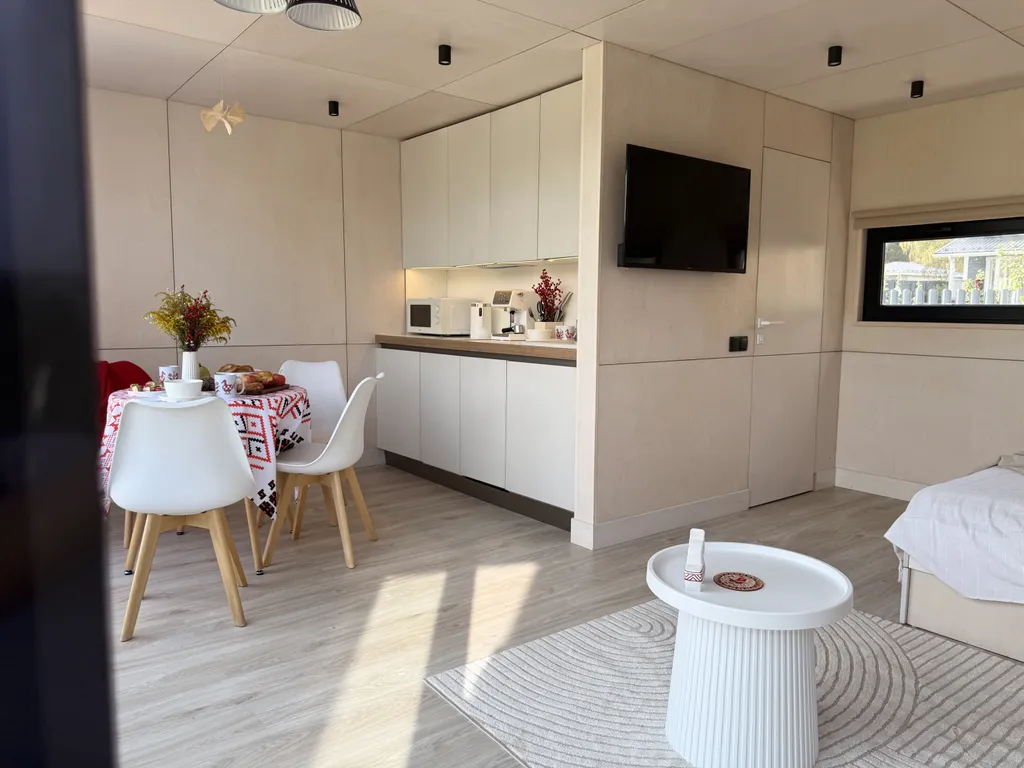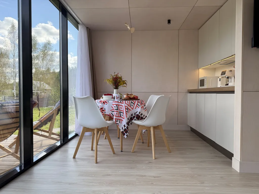 Дом рассчитан до 2х человек с отличным зонированием: небольшая кухня со столом, стульями, варочной панелью, холодильником, посудомоечной машиной и всем, что может понабиться на время проживания: чайником, кофемашиной, СВЧ, тостером и набором посуды. Соль, сахар, чай-кофе, растительное масло – всегда в наличии. В зоне отдыха на уютном диванчике нет ничего лучше, как просмотр фильма за чашечкой какой с зефирками или бокалом вина и разговорами о сокровенном с близким человеком.