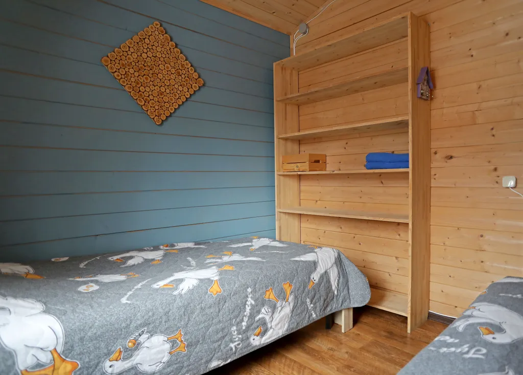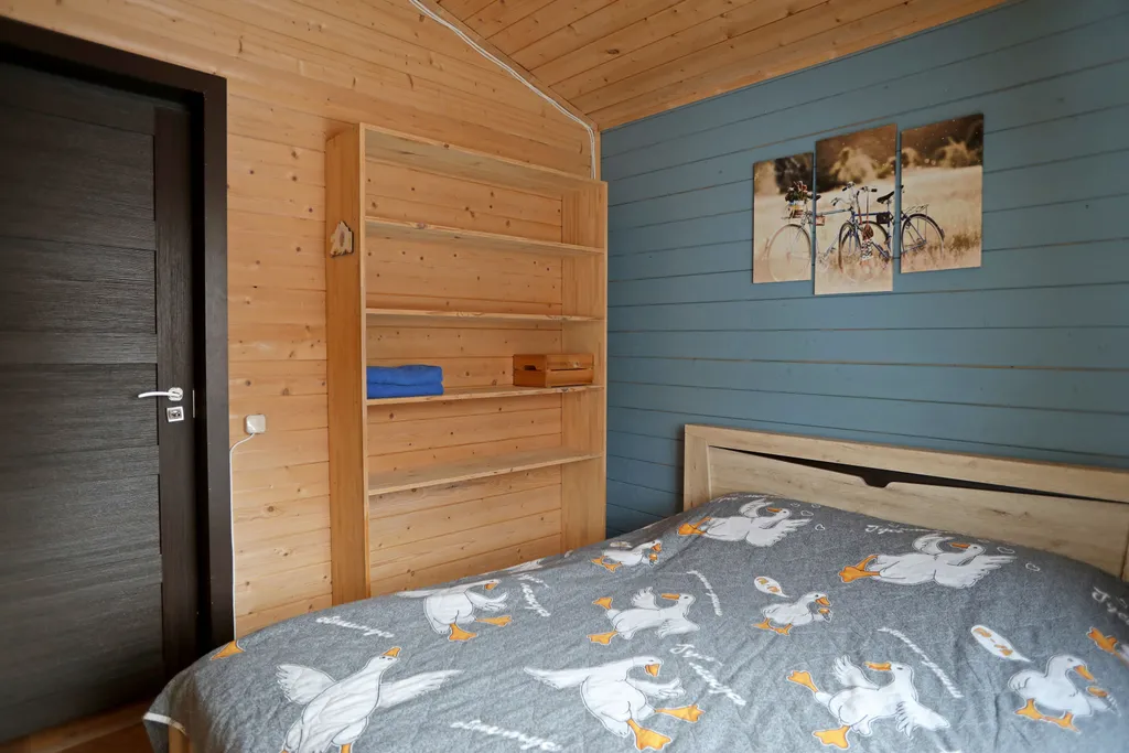 В доме две уютные спальни: одна с двуспальной кроватью для пар, вторая — с двумя односпальными кроватями для друзей или детей. Каждый найдет свое личное пространство для спокойного сна. Также в общей зоне имеется двуспальный раскладной диван.