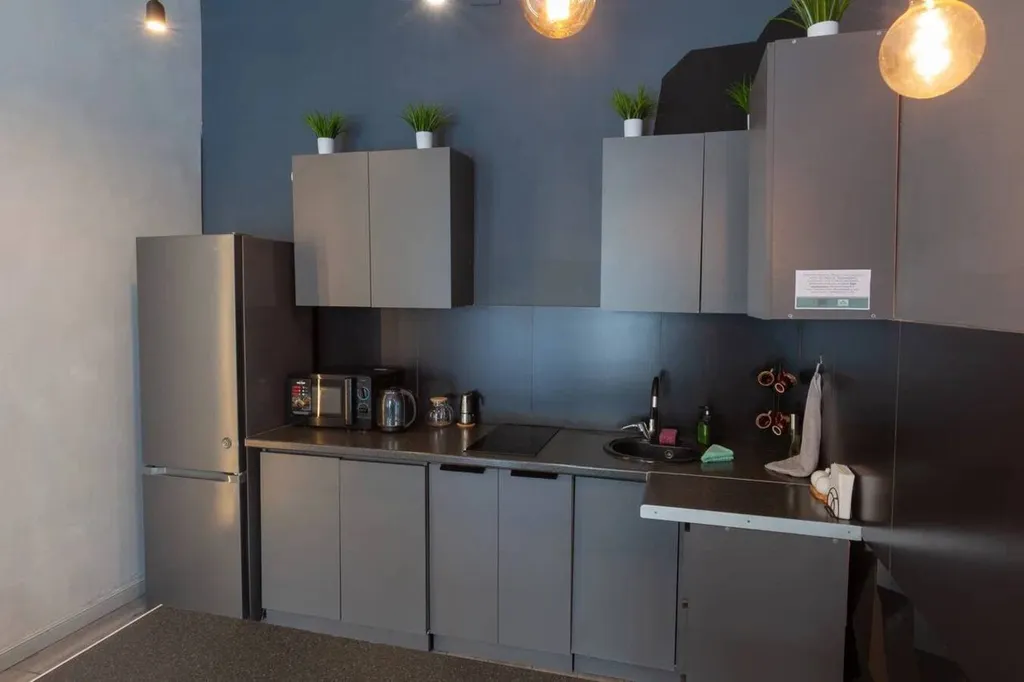 — кухня: холодильник с морозилкой, варочная панель, духовой шкаф, микроволновка, чайник, гейзерная кофеварка, посуда