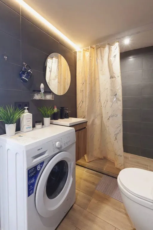 — современный санузел: горячая вода, стиральная машинка, полотенца, халаты, тапочки