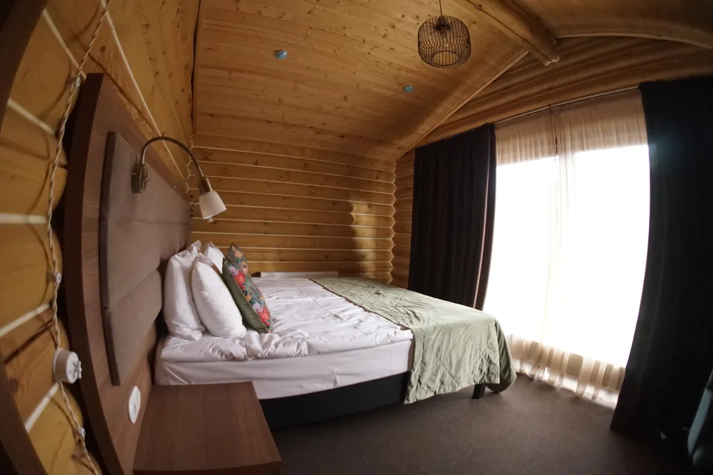 Шале оснащен панорамным окном в спальне с видом на горы. Здесь комфортно разместятся три гостя - в распоряжении двухспальная кровать и раскладное кресло.