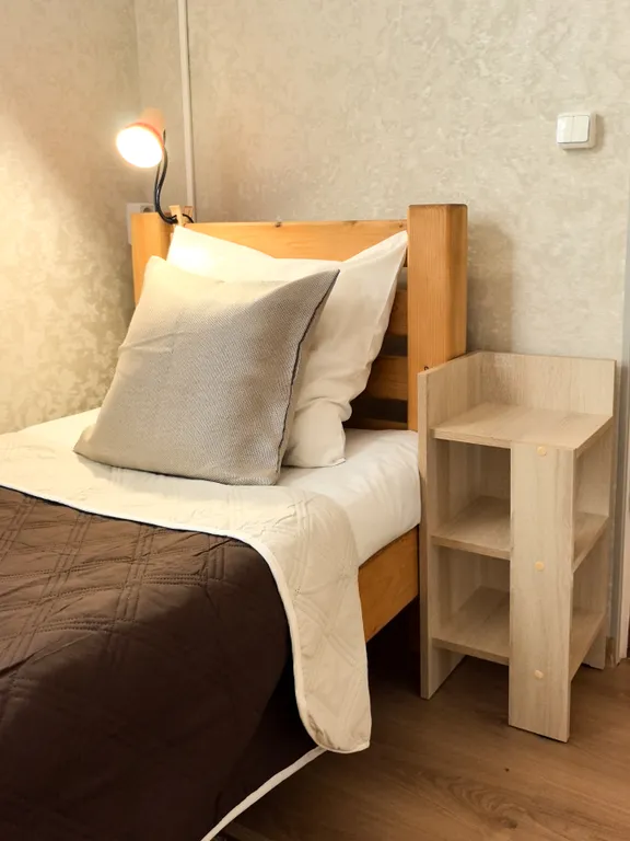 В коттедже одна комната с двуспальной кроватью и двумя односпальными кроватями. Всего 4 спальных места.