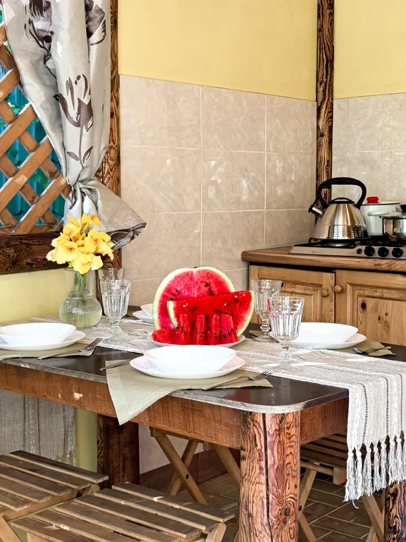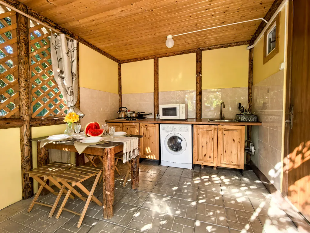 Коттедж имеет веранду с зоной отдыха и кухонной зоной. Оборудован всем самым необходимым для отдыха и приготовления завтрака, обеда и ужина. Все удобства в коттедже.