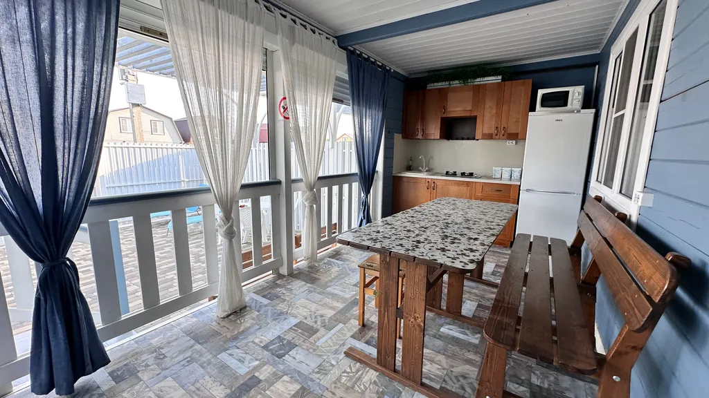 Кухня на террасе полностью оборудованная: микроволновая печь, большой холодильник, газовая плита, кулер.