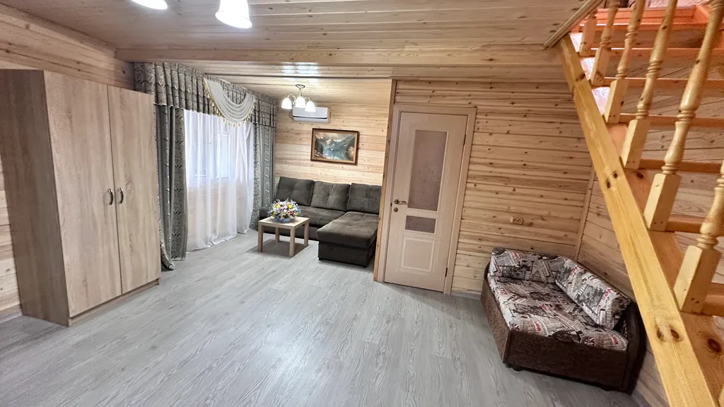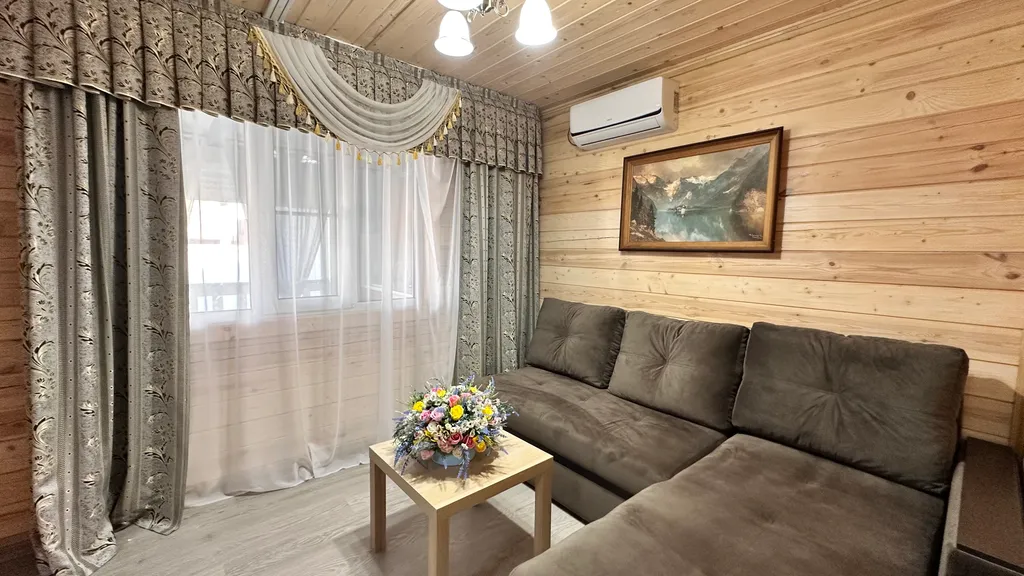 На первом этаже гостиная: диван на два человека, диван одного человека, телевизор, кондиционер.