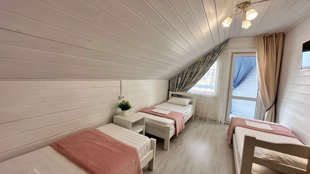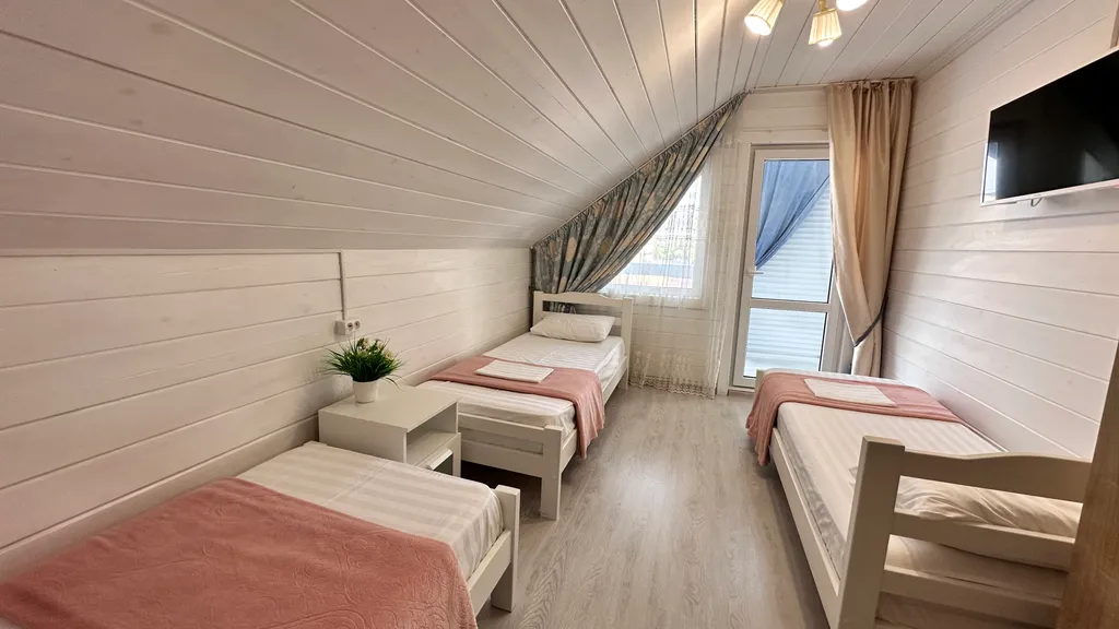 Спальня 2 — три односпальные кровати, телевизор, кондиционер, постельное бельё, балкон.