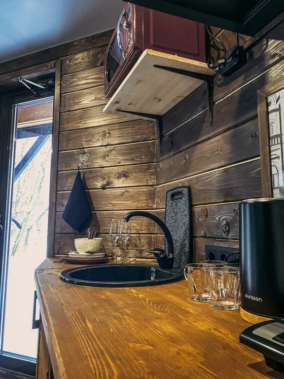 Кухонная зона: холодильник, чайник, набор посуды на 5 человек