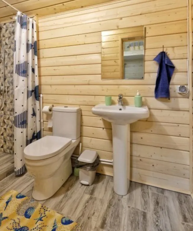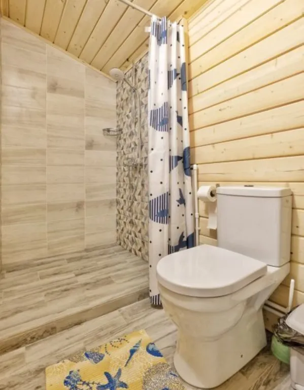 Санузел с душем, туалетом и бойлером — горячая вода всегда в доступе.