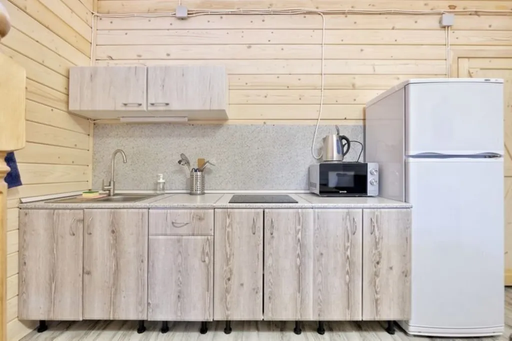 Кухня-гостиная объединяет всех за большим обеденным столом. Здесь есть всё для домашних посиделок: электроплита, холодильник, микроволновая печь и полный набор посуды. Вечерами можно с комфортом устроиться на диване и смотреть телевизор.