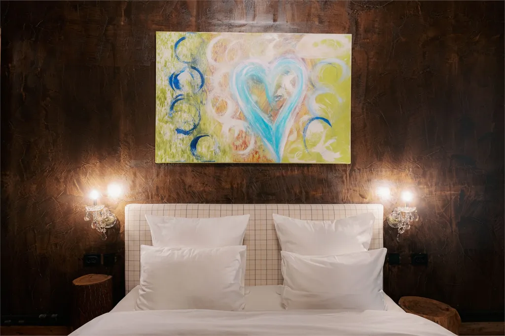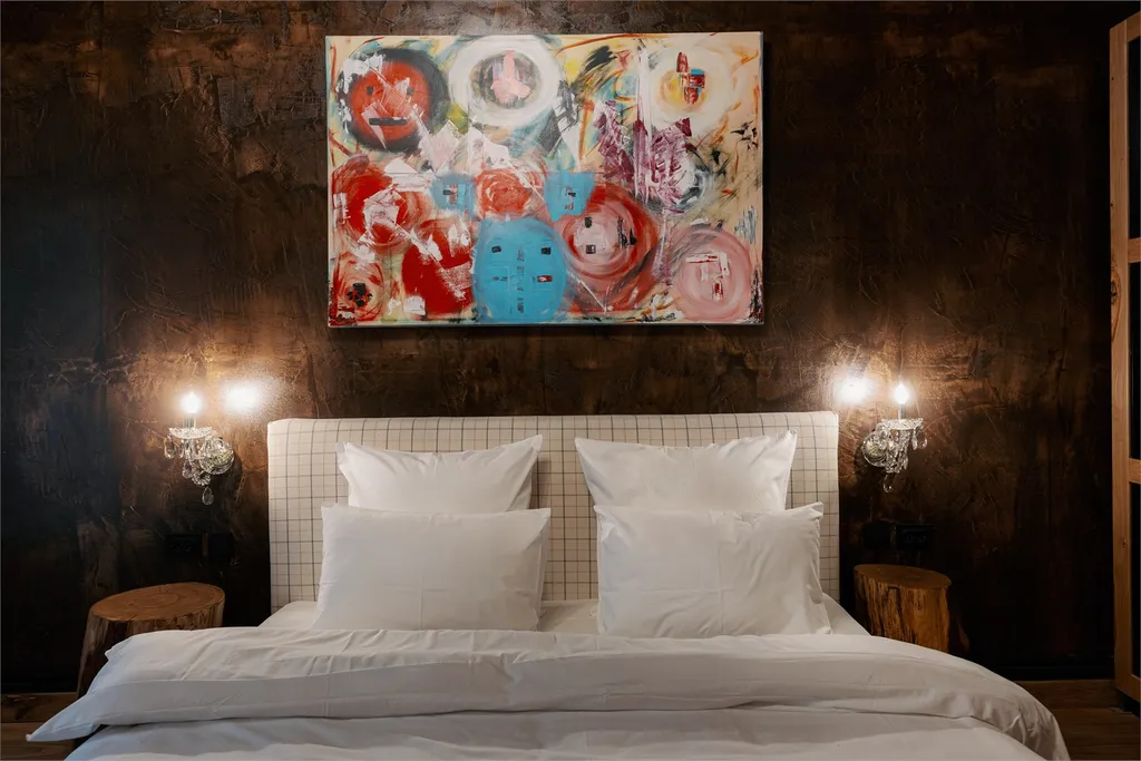 При создании интерьера дизайнеры вдохновлялись работами Василия Кандинского – одного из основоположников абстрактного искусства. Художник отказался от предметного изображения, превратив цвет и форму в самостоятельный язык эмоций. Его работы строятся на ритме линий, цветовых акцентах и внутренней «музыкальности» композиции. В интерьере коттеджа эта идея получила мягкое прочтение: пространство выполнено в нежной бежевой гамме с молочными и песочными оттенками, натуральное дерево, камень и арт-объекты создают спокойный фон, а точечные яркие акценты в декоре отсылают к динамике абстрактной живописи. Атмосфера остаётся лёгкой, уютной и гармоничной – с характером, но без драматизма.