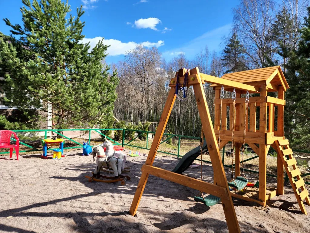 — собственная большая, оборудованная детская площадка на территории(батут, качели, песочница, горка, игрушки)