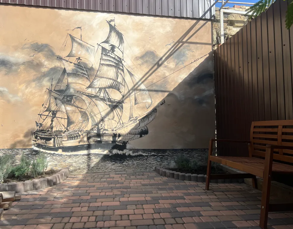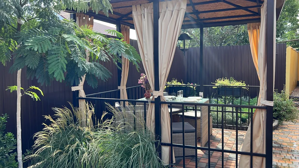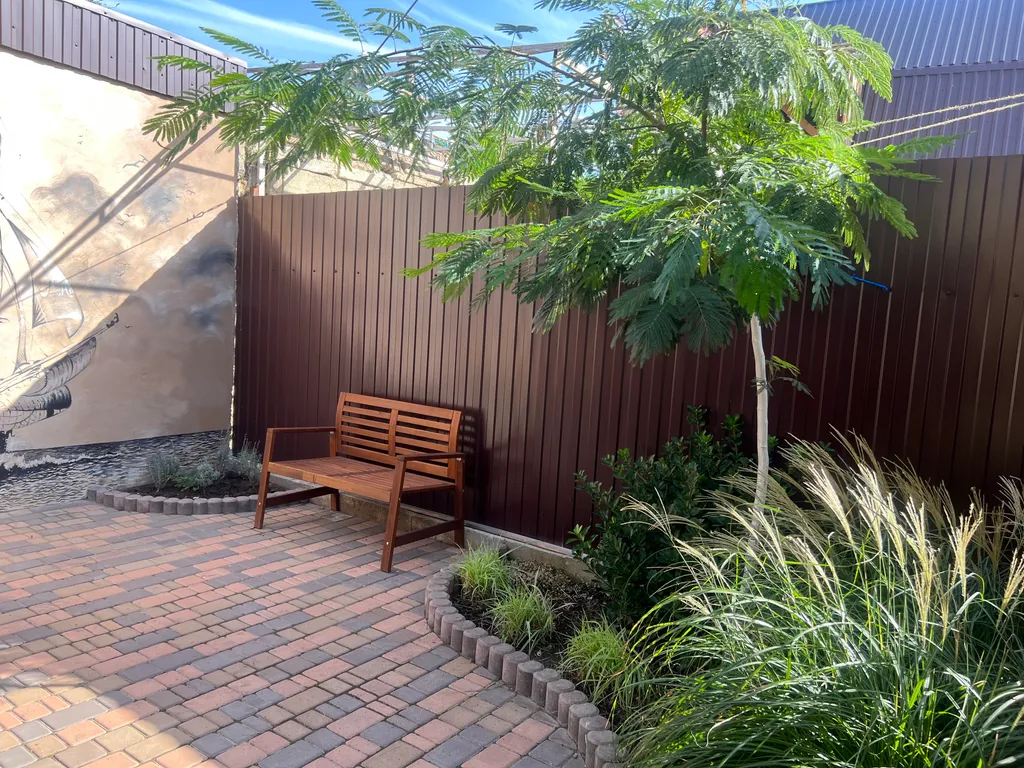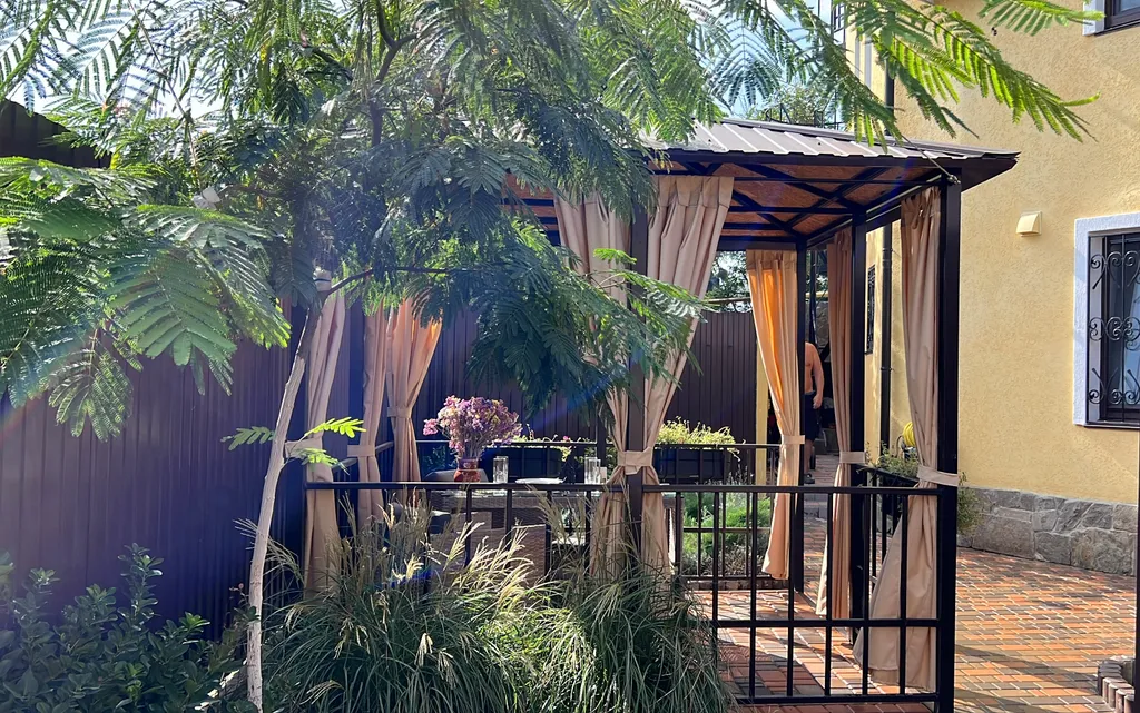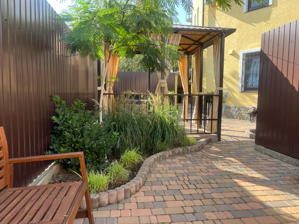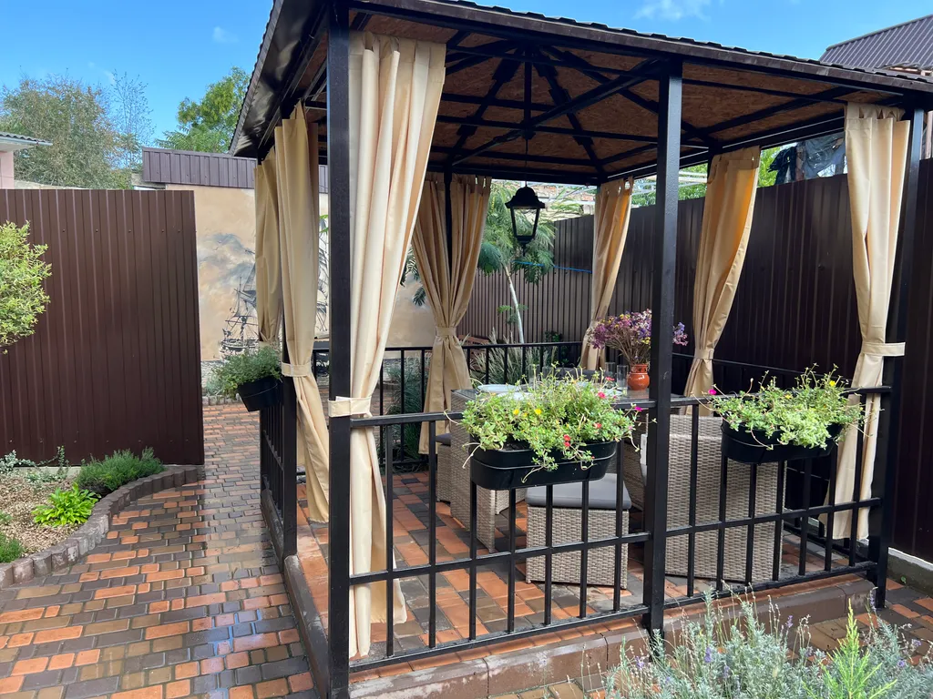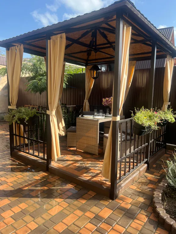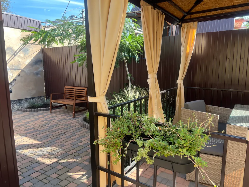 Свой отдельный дворик, с беседкой для отдыха, мангалом, есть выход на террасу по внешней лестнице. Можно загорать на шезлонгах.