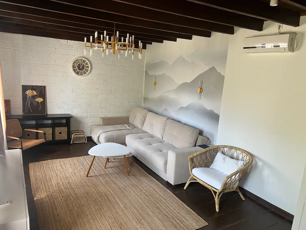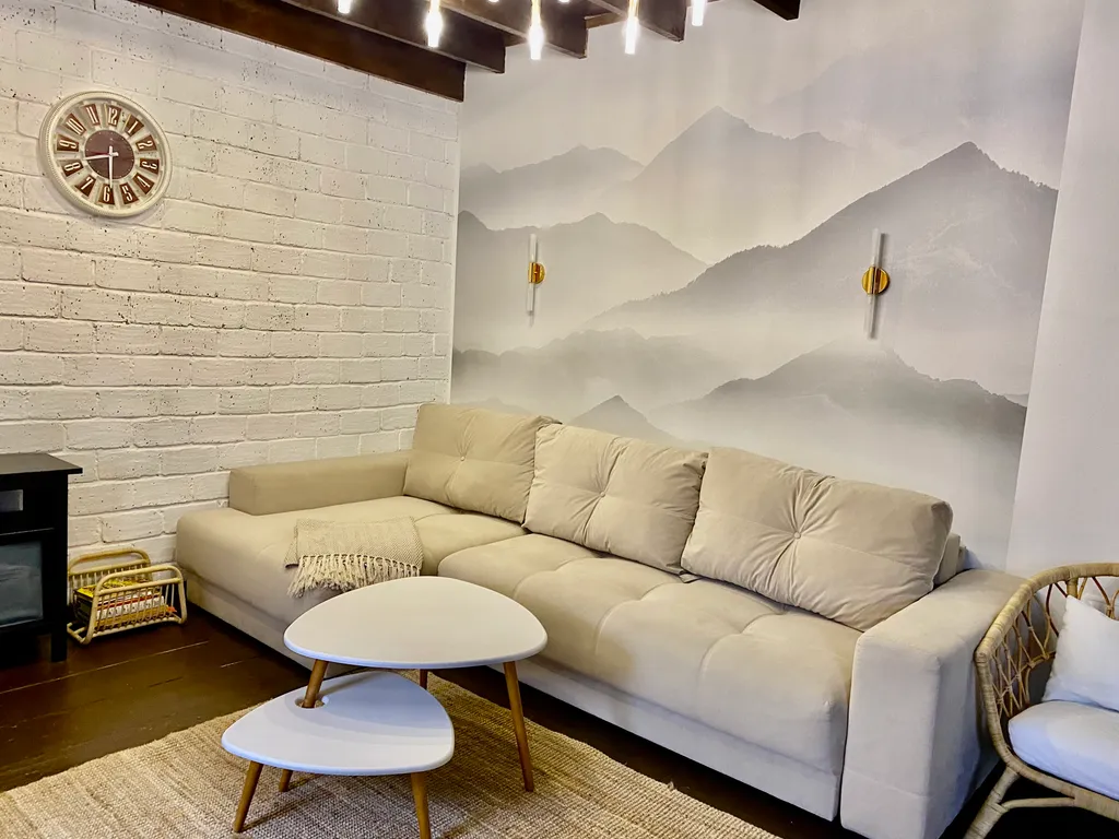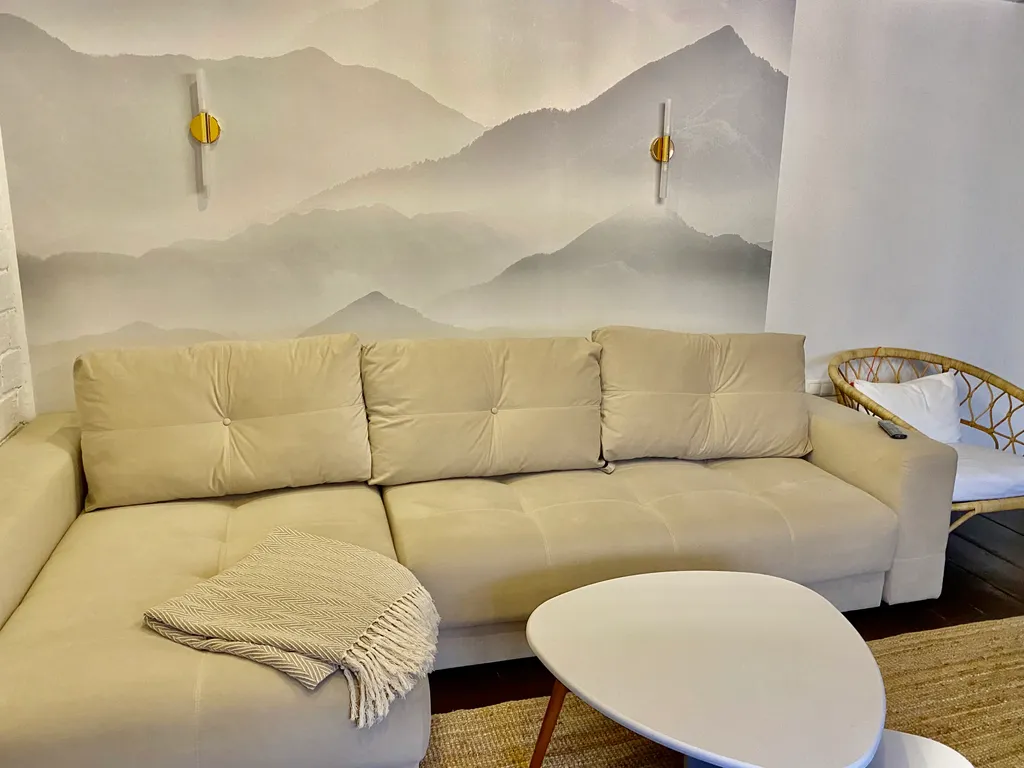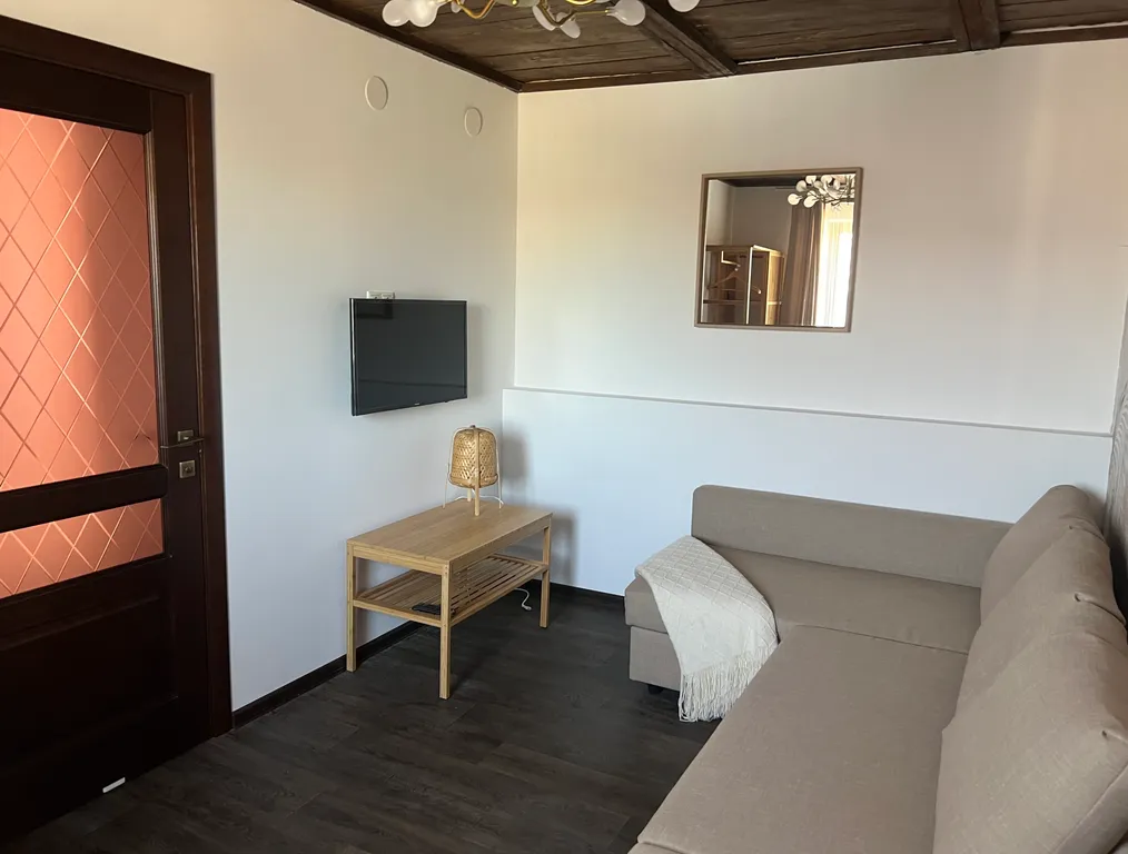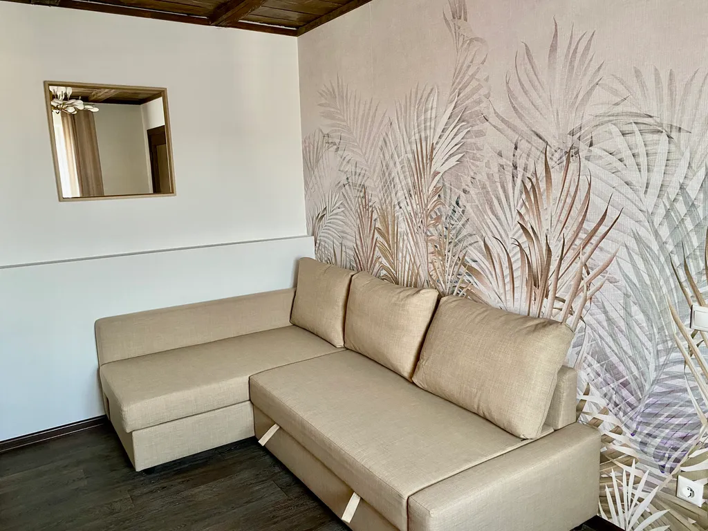 Гостиная: двуспальный диван, телевизор, кресло, столик журнальный, комод.