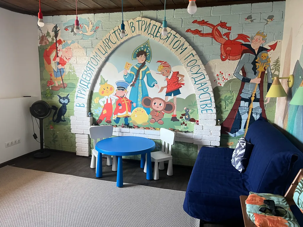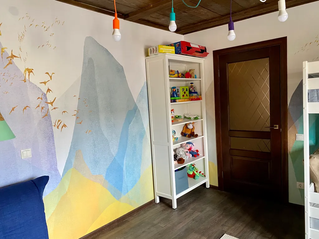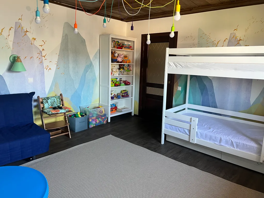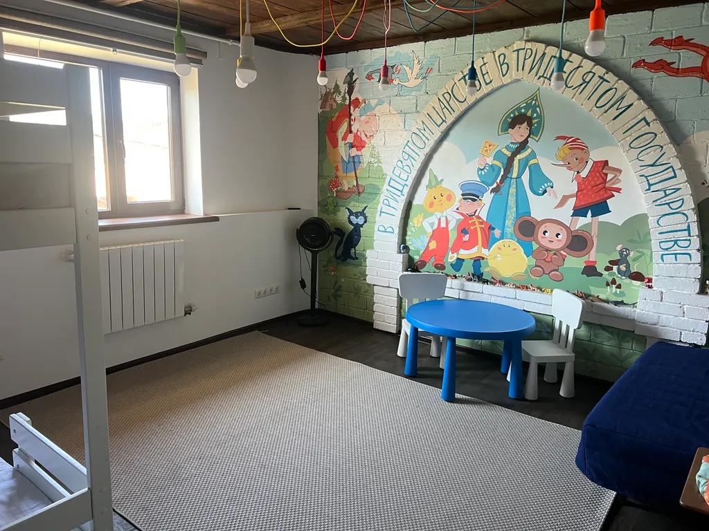 Комната 3(детская): двухъярусная кровать, раскладной диванчик, детский столик, стульчики. Есть стульчик для кормления и манеж.