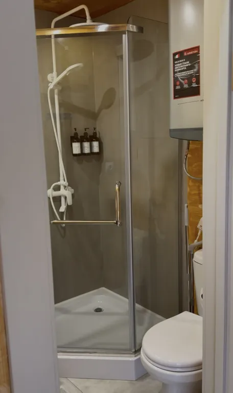 Уютный дом-сфера с двуспальной кроватью и спальным местом на верхнем уровне.