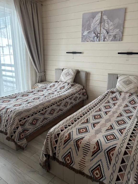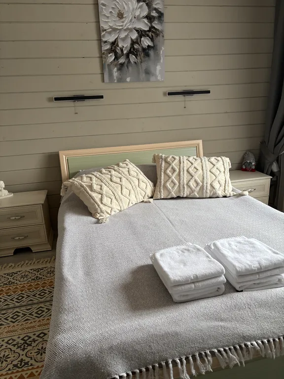 В доме 2 спальни (2 односпальные кровати и 1 двуспальная кровать) и гостиная (двуспальный диван-книжка).