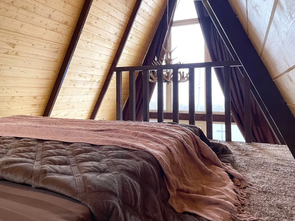 На втором этаже домика располагается двуспальная кровать, а на первом раскладывающийся диван