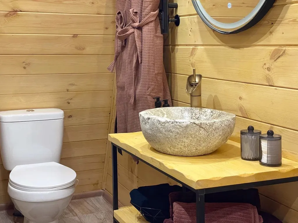 В домике очень тепло. Для тепла и уюта на первом этаже установлен камин, а также теплый пол.