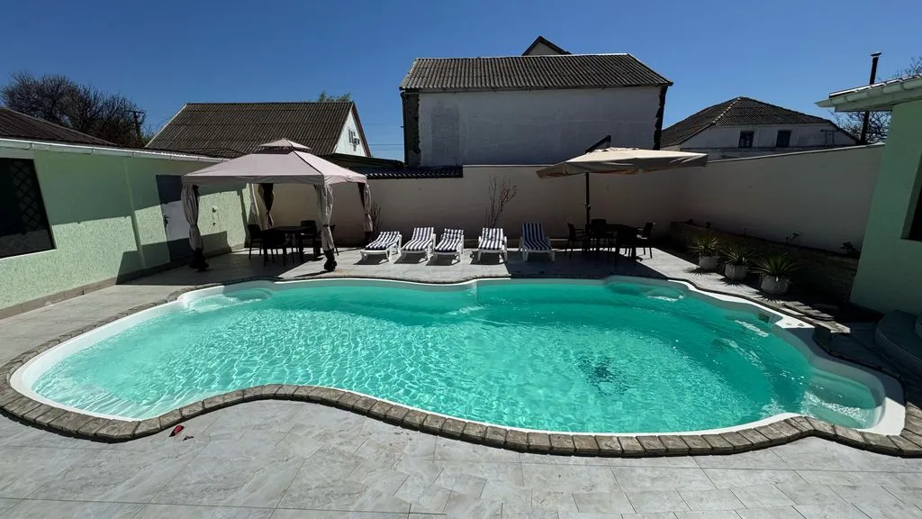 На побережье Черного моря, вдали от городской суеты, в 60 километрах от Евпатории, в селе Стерегущее, предлагаем комфортабельный отдых с бассейном 5 на 10 м. На территории расположены 2 номера площадью 50 м и дом с баней площадью 60 м., состоящие из отдельной спальни и кухни-гостиной с двуспальным диваном, санузел. Всё укомплектовано новой мебелью, бытовой техникой, включая плазменный телевизор, кондиционер, холодильник, плиту, духовой шкаф, микроволновую печь, фен, утюг. К дому пристроена большая летняя веранда с зоной барбекю, кухней и мебелью для комфортного досуга на свежем воздухе, охраняемая парковка, детская площадка. До ближайшего пляжа 5 минут пешком. До пляжа заповедника «Бакальская коса» 5 минут на авто. Магазин рядом. Также отдыхающих на собственном микроавтобусе сопровождаем в магазины, на экскурсии и на пляж Бакальской косы. Пользование баней не входит в стоимость проживания, на неё отдельный прейскурант!