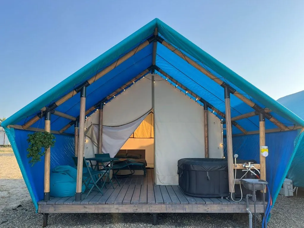 Глэмпинг Выдох расположен в 50 метрах от побережья Азовского моря. На террасе каждого номера размещён индивидуальный спа бассейн с джакузи, подогревом и ультрафиолетовым фильтром. В каждом номере: 2 односпальные кровати 80 на 200 см., трансформируемые в двуспальную, диван-кровать со спальным местом 120 на 190 см., шкаф для одежды, холодильник, микроволновая печь, эл. чайник, индукционная плита, сплит ситема, посуда, постельное бельё из сатина премиального качества, полотенца. На территории имеется мангальная зона и благоустроенные санузлы и душевые с горячей водой. Вода проходит многоступенчатую очистку, поэтому в душе и в кранах у нас питьевая вода.