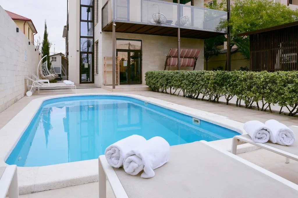 Дом Сафино Сириус расположен в федеральной территории «Сириус», до моря 15 мин. пешим шагом, рядом есть вся инфраструктура, магазины, аптеки, рестораны. Всего 9 номеров, общая площадь дома 300 кв. м., площадь участка 5 соток, в стоимость входит пользованием общей территорией, террасами, детской площадкой, барбекю зоной, бассейном. Бассейн подогреваемый +28°+30°. Также на территории есть баня, но она идет отдельным прайсом. На территории: двухэтажный детский комплекс с игрушками и детской мебелью, качели вокруг дома, возле номеров места для отдыха со столиками и стульями, шезлонги вокруг бассейна, мангальная зона со столиками и диванами для пикника и тут же место для курения. Бассейн 6,5м на 3м и глубиной 1,5 м, вокруг бассейна шезлонги и зонтики. Деток до 7 лет в сопровождении с родителями. Стиральные машинки на крыше для общего пользования Вокруг дома много террас, также есть открытая терраса на крыше с кухней и зоной для пикника, с шезлонгами для загорания и с зонтами от солнца. Сауна (по запросу) Курение в доме запрещено, есть отдельное отведенное место для курения, в мангальной зоне. Мы ориентированы на семейный отдых с детьми, поэтому с животными не размещаем и шумные мероприятия в период с 21:00 до 9:00 запрещены! Расчетный час: заезд после 14:00, выезд до 11:00. Ранний заезд и поздний выезд обсуждаются заранее. Заселение производится по паспорту. При заезде необходимо оплатить страховой залог в размере 5000 руб. Залог возвращается после уборки в случае отсутствия признаков порчи имущества. При отмене бронирования предоплата не возвращается, но возможен перенос дат или ожидание сдачи данного периода, по уважительным причинам возможен возврат, рассматриваем каждую бронь индивидуально